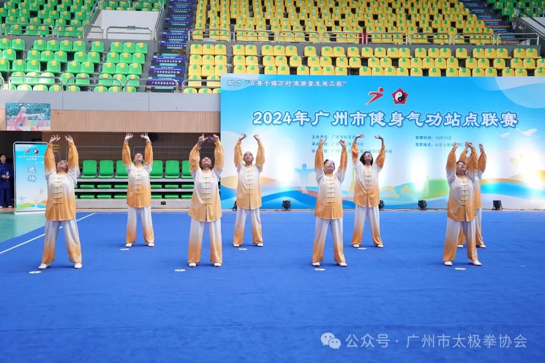 发表时间:(2024-10-16 17:20:00)2024年10月15日,2024年广州市健身气功站点联赛在从化七星体育馆举行。本次比赛由广州市体育局主办、广州市太极拳协会承办、广州市从化区文化广电旅游体育局协办。来自全市各区的11支代表队88名运动健儿齐聚赛场、竞相竞技。本次比赛采用2021年出版发行的《健身气功竞赛规则与裁判法》,设健身气功八段锦、五禽戏、易筋经三个集体项目,均为国家改编推广的缩短版普及功法。赛事旨在推动全民健身项目高质量发展,加快构建更高水平的全民健身公共服务体系,助力广州实施“百县千镇万村高质量发展工程”,促进乡村振兴、健康中国建设,加强健身气功在基层的推广普及,积极倡导健康生活方式,打造健身气功活动品牌,形成全民健身新风尚。